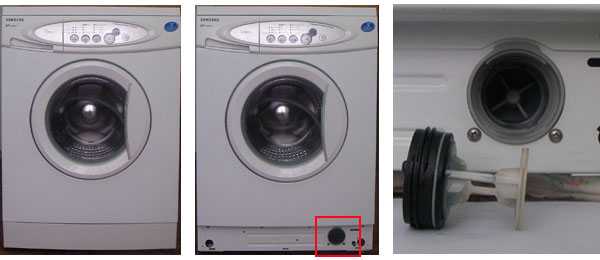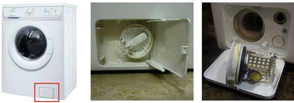 - Под загрузочным люком установить емкость воды с низкими бортами. В этой же области находится фильтр насоса, которые необходимо выкрутить и почистить при необходимости.