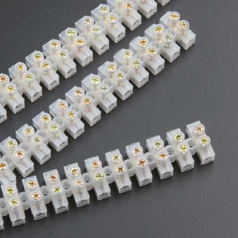 Клеммная колодка винтового типа предполагает надёжную фиксацию всех соединяемых многожильных проводов при помощи винта. Чтобы увеличить площадь проводного контакта с токопроводящей поверхностью требуется выполнить дополнительный загиб жилы.