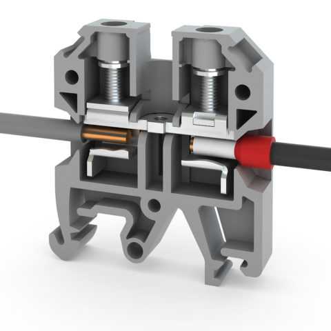 Принцип действия прижимных клемм предполагает фиксацию провода при помощи встроенного пружинного механизма.