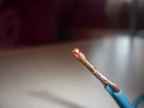 Нанести на жало паяльника расплавленный припой и аккуратно перенести его на оголённые части жилы. После лужения провода следует соединить друг с другом скруткой, которая в обязательном порядке «подтягивается» плоскогубцами.
