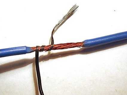 - Удалить с концов проводников изоляцию. Наложить оголённые концы друг на друга и выполнить обмотку первой жилы.