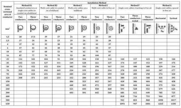 Таблица 3. Допустимые токовые нагрузки для кабеля с медными жилами прокладываемого скрыто