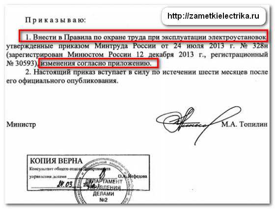 Дополнение 3: 19 февраля 2016 года вышел Приказ №74н Министерства труда и социальной защиты РФ об изменениях в Правилах по охране труда при эксплуатации электроустановок (ПОТЭУ), который был зарегистрирован в Минюсте РФ 13 апреля 2016 года под №41781.