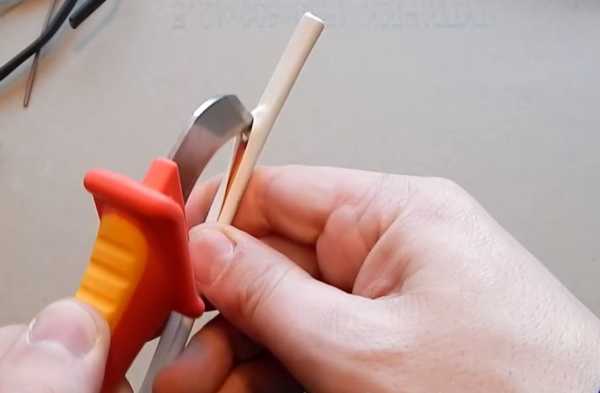 Если вначале трудно просовывать пятку в кабель, то можно при помощи пассатижей или узкогубцев немного сжать провод, при этом под изоляцией образуется щель, в которую можно с легкостью просунуть инструмент. Другой способ легкого начала — немного прорезать начало провода обычным ножом. Как удобней, решать каждому для себя, но удобство ножа с пяткой оценит как специалист со стажем, так и начинающий электрик.
