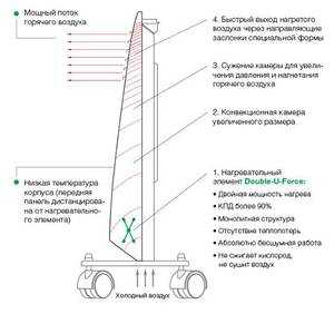 Конструкция устройства имеет конвекционную камеру с вмонтированным в корпус нагревательным элементом. Особенностью работы конвекторного обогревателя является быстрое и равномерное прогревание помещения. Подогретый воздух движется через специальные щели и направляется на стены и пол.