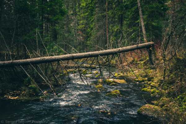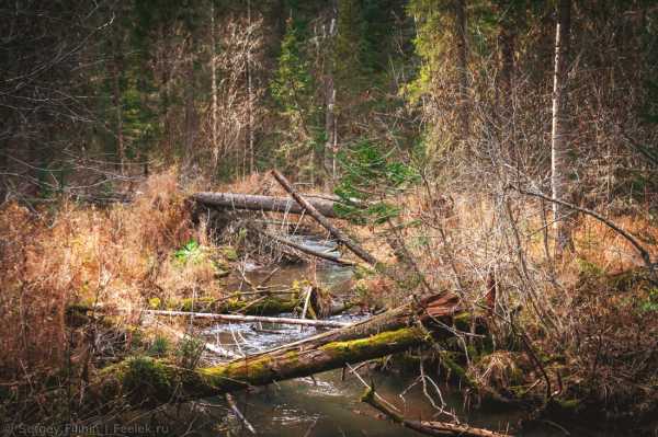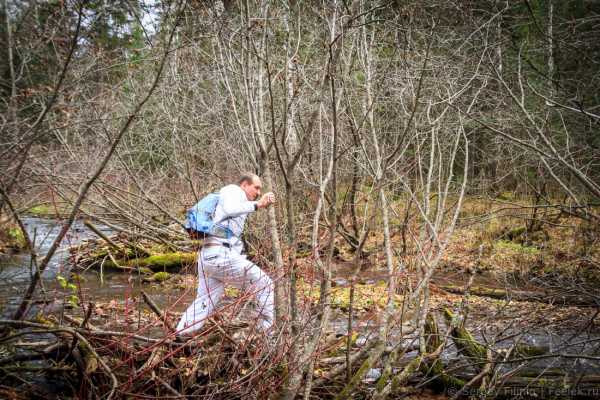 31. После столба Седлового тропа снова потерялась. Но опять же понятно было, что нужно спускаться и идти по логу вдоль ручья Миничева Рассоха. Метки на деревьях были, но следы самой тропы едва угадывались. Зато на грязи виднелось множество звериных следов, в основном мелких, а также каких-то копытных и даже следы медведя. Это был самый тревожный участок пути, ведь понятно, что этот узкий лог является местом притяжения всех обитателей местности, а дорога здесь может быть всего одна - вдоль этого самого ручья.