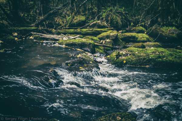 26. Внизу вышли на ручей Глухариный и вдоль него дошли до речки Мокрый Калтат. Судя по карте, где-то в этом месте ручей должна пересекать тропа, которая идет в нужную сторону. Никакой тропы видно не было, поэтому начали подниматься сквозь бурелом на хребет.
