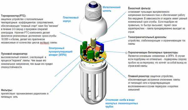 Что бы знать причину этого явления, стоит заглянуть в середину экономки и узнать ее начинку. Многие люди думают, что она работает, как и лампа накаливания, от переменного тока в 220 В. Однако это не так, энергосберегающая работает по другому принципу.