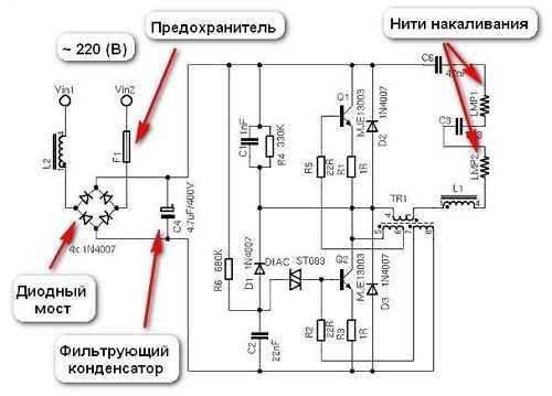 - Когда перегорает одна из нитей накала, лампа перестает гореть. В этом случае проверяем исправность конденсатора С5. Там, где накал оборван, выпаиваем диод, а на его место вставляем 10 Ом резистор.