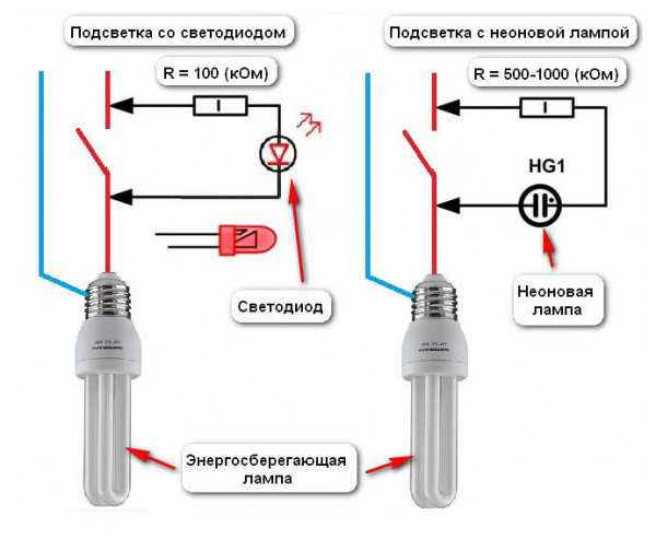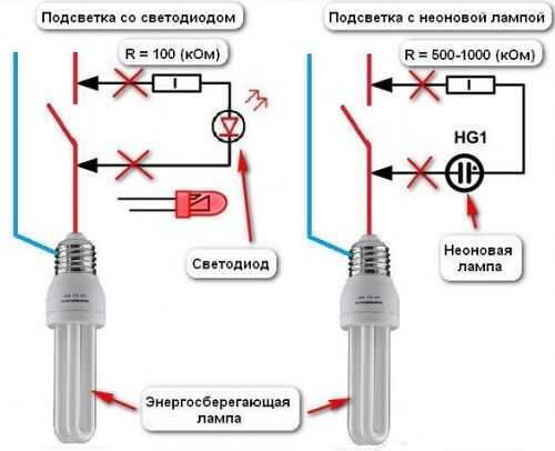 4. Четвертый способ в техническом отношении дублирует 3, только дополнением станет не лампа накаливания, а конденсатор или 2 Вт резистор с сопротивление 50 кОм в качестве шунтирующего элемента. Через него пойдет ток небольшой, но достаточный для того, чтобы лампочка подсветки работала.