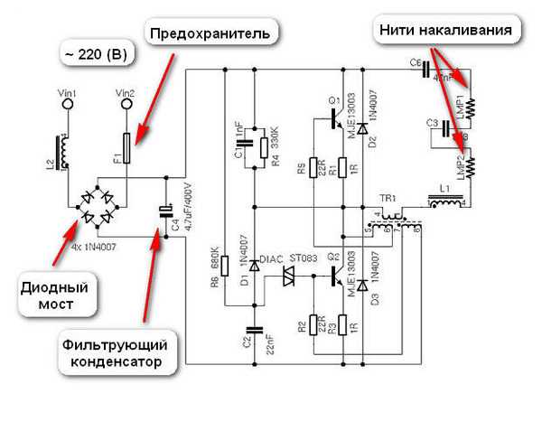 - По этой же причине возникает и такая неисправность, как пробой конденсатора С5. Лампа при этом светится только там, где находятся нити накала. Конденсатор меняем.