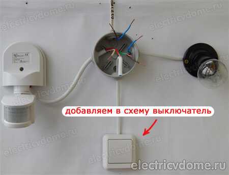 К уже существующей схеме, созданной указанным выше способом, можно подсоединить отдельный обычный выключатель. Это необходимо в тех случаях, когда есть потребность автоматического включения и одновременно нужен контроль за освещением с помощью обычного прибора. Такой выключатель подключается к датчику движения непосредственно через фазу к сегменту провода между датчиком и лампой.