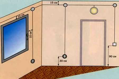 - провода при электромонтажных работах кладутся на стенах вертикально либо горизонтально, на потолке – по кратчайшему расстоянию до точки освещения;