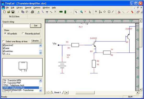 3.TinyCAD Это программа позволяет рисовать схемы цепей. Включает в себя библиотеку символов для немедленного начала разработки. Кроме того помимо возможности распечатать ваши наброски, так же Вы можете публиковать свои схемы с помощью копирования изображения в Word файл или сохранить их в формате PNG.