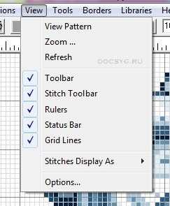 Меню View (Просмотр) View Pattern — просмотр схемы целиком. Zoom — изменить масштаб схемы Refresh — обновить. Далее следуют настройки кнопок быстрого доступа (сверху, сбоку и др.) Options — настройка схемы. Здесь можно поменять линейку с дюймов на сантиметры. Поменять цвет фона (канвы). Поменять сетку, деление схемы на квадраты (например, 5х5 клеток или 10х10 клеток) и т.д. Stitches Display As — изображение стежков на схеме (черно-белые символы, цветные кубики, цветные кубики с символами).