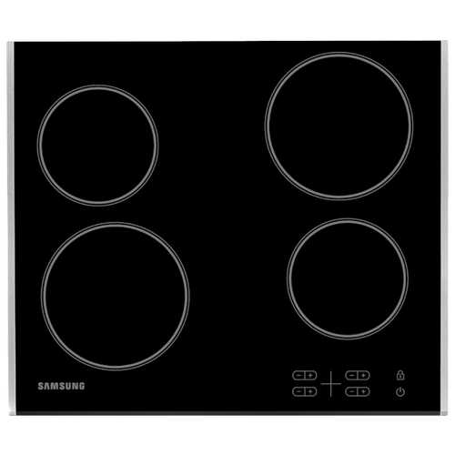 Продолжает наш рейтинг варочная панель знаменитой корейской торговой марки Samsung C61R1ADMST изготовлена в лаконичной форме черного цвета с глянцевой устойчивой стеклокерамической поверхностью. Производится в Таиланде. Ее размеры составляют 5x57.5x50.5 см, вес без упаковки – 8 кг. Размеры для встраивания - 56 x 49 см. По периметру нанесена эстетичная рамка.