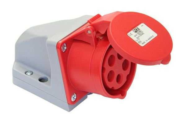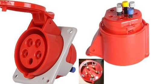 - Стационарная розетка на 380 вольт скрытого типа установки, устанавливается в местах постоянного пользования, отличительной особенностью таких розеток является то, что они монтируются в специальные монтажные короба или в силовые щиты, при этом механизм розетки спрятан внутри базовой поверхности, на которую она установлена. Различают розетки на четыре и на пять контактов;