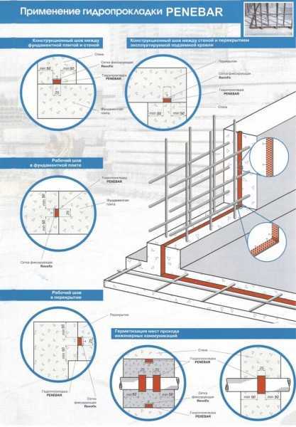 Для надежной и долговечной гидроизоляции этих стыков очень просто и эффективно использовать гидроизоляционную прокладку Пенебар (гидроизоляционный шнур).