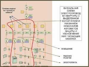 Здесь указаны предельные значения мощности и тока для каждого унифицированного сечения проводов кабеля, как правило, марки ВВГнг, часто применяемого для кухонной электропроводки. То есть, если нагрузка превышает 5,9 кВт, то необходимо выбирать кабель с сечением жил 4мм².