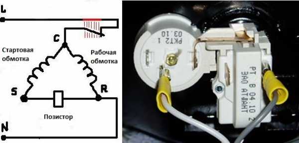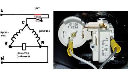 В современных бытовых холодильниках применяется пускозащитное реле с встроенным позистором (резистор, увеличивающий сопротивление при повышении температуры). Схема этого устройства (рис.2) аналогична индукционному реле, только вместо катушки для замыкания и размыкания пускового контакта используется позистор, подключенный в стартовую цепь.