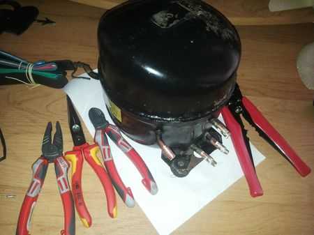 Следующий этап #8212; проверка снятого агрегата на работоспособность. Для этого его нужно подключить к электрической сети. Если компрессор работает, отчетливо слышен звук шипения #8212; воздух им засасывается в одну трубочку и выбрасывается в другую. Извлекать узел из старого холодильника следует максимально аккуратно, чтобы находящееся в нем масло осталось в целости и сохранности. Нужно перерезать кабель, идущий к датчику температуры, затем нужно измерить сопротивление и изучить местонахождение замкнутых контактов, которые будут использоваться во время дальнейшей сборки, очень хорошо, если сохранилась схема электроцепи старого холодильника.