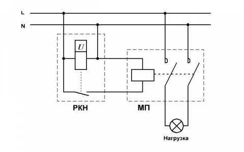 Из приведенной схемы видно, что реле контроля (U) подключено постоянно к находящейся под контролем сети. С помощью него измеряется значение подаваемого напряжения. В случае, если напряжение соответствует предустановленным значениям, происходит включение автоматического повтора включения (АПВ). АПВ включается при истечении необходимого промежутка времени, после чего контакты замыкаются, и происходит подключение тока к сети. Схема подключения однофазной нагрузки с помощью магнитного пускателяС помощью реле контроля можно осуществлять управление такими коммутационными аппаратами, как магнитные пускатели. Работа данной схемы происходит точно так же, как и в первом случае. Различие заключается в том, что вначале при работе включается или отключается магнитный пускатель, который, соответственно включает и выключает сетевую нагрузку. Подобрав пускатель с необходимыми параметрами, можно подключать нагрузку какой угодно мощности.