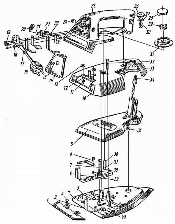 Отвернуть винт 15 (рис.2) и снять крышку 14, отвернуть винты 19, снять шайбу 18 и петли шнура. Снять диск 31 с пружиной 29 и циферблатом 28 и разобрать его на отдельные детали. Отвернуть два винта 32, снять корпус 10 с ручкой 25, головку 26 парорегулятора и пружинную шайбу 27. Снять бачок 9 с парорегулятором 34. Отвернуть винт 7 с шайбой 37 и винт 8. Снять блок 6 контактов. Заменить подошву 1 утюга.
