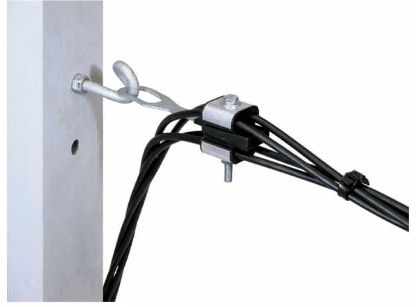 Провод натягивают и крепят к стене дома при помощи крюка и нескольких анкеров. Если говорить о столбе, то здесь надлежит крепить с использованием бандажной ленты. Из этого следует, что крюк должен иметь отверстие для вставки под анкер.