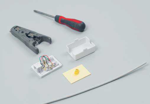 | 1. Приготовьте телефонную розетку 6P4C и все необходимое для монтажа. Монтаж накруткой пригоден только для одножильного кабеля. | 2. Нанесите маркеры на кабель. Выполните кольцевую подрезку оболочки кабеля инструментом и снимите верхнюю изоляцию. | ||