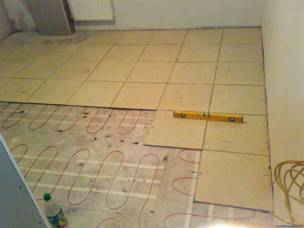 - Теплый пол заливается плиточным клеем, на который кладется кафель.