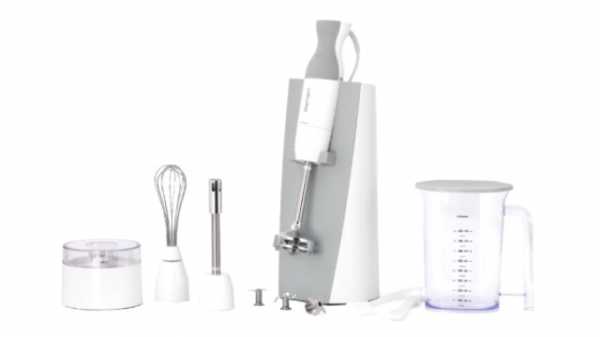 Дизайн погружного блендера продуман, чтобы не только красиво выглядеть, но и позволять использовать прибор с максимальным комфортом. Поэтому переключать режимы можно всего одной рукой, не прекращая рабочий процесс. Среди комплектующих: