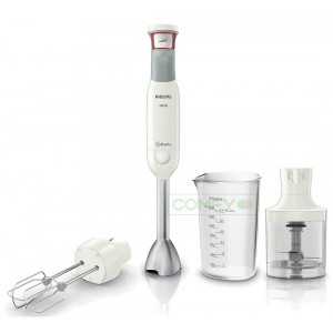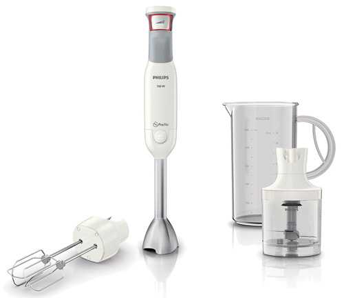 Получить огромное удовольствие от приготовления любимых кулинарных шедевров предоставляет нам модель погружного блендера марки Philips. Довольно хорошие отзывы о погружном блендере данной модели можно прочитать в различных источниках. Характеристики прибора: электронное управление, высокая мощность мотора (700 Вт), турборежим, 10 скоростей, которые плавно регулируются, интуитивное управление скоростями кнопкой SpeedTouch (более сильное нажатие увеличивает скорость измельчения пищевых продуктов), большой мерный стакан (1,2 л), а также небольшая мельничка (0,3 л). В комплект к прибору идет насадка-миксер с двойным металлическим венчиком. С помощью очень острых, нержавеющих ножей можно колоть лед, измельчать орехи, эффективно и быстро достигать однородной консистенции обрабатываемых продуктов. Минусы: достаточно коротковатый сетевой шнур, маленький объем чаши для измельчения, также в данной модели блендера нет функции суповарки. Производитель – Philips, Нидерланды.