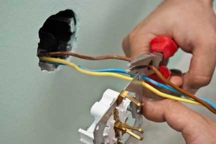 Зачищенные от изоляции концы проводов вставляют в клеммы, закручивают винтами или закрепляют защелками. Для провода заземления, который можно узнать по желто-зеленой изоляционной пленке, предназначена отдельная клемма