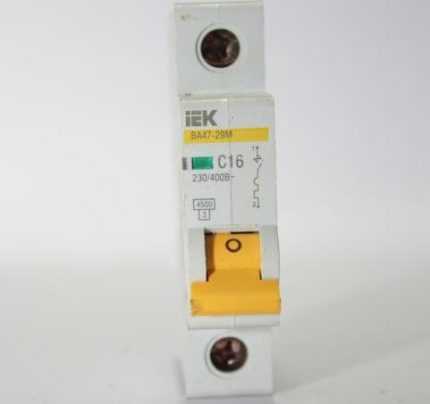 Образец подходящего по параметрам автоматического выключателя для линии, проведенной к посудомойке. Номинальный ток – 16А, вр/ток хар-ка – С, класс токоограничения – 3