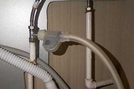 Чтобы машину можно было использовать в любое удобное время, следует шланг подачи воды присоединить к трубе или гибкой подводке резьбовым соединением посредством тройника или переходника.