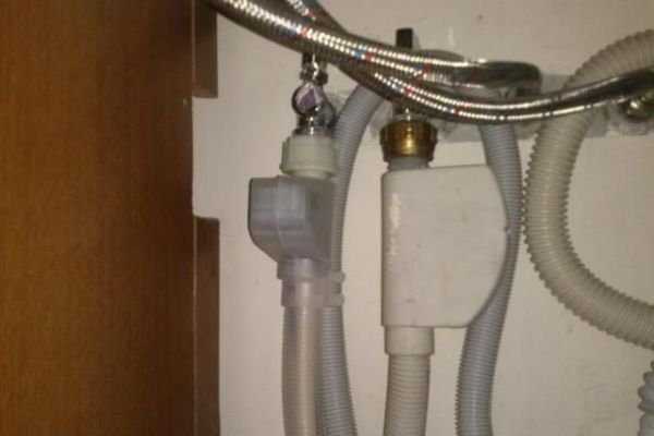 - Подключение с использованием косого тройника не самый лучший вариант. Но иногда он становится единственным. Такой способ используют, если раковина находится далеко от подключаемой техники. Чтобы на сливной насос не происходила дополнительная нагрузка, сливной шланг удлинять запрещено. Поэтому в трубу канализации врезают тройник (выбирают ближайшее место к технике). Затем к тройнику подключают сливной шланг. Чтобы в рабочую камеру машины не попало канализационное содержимое, шланг делают с подъемом и спуском. Дополнительно установленный антисифонный клапан защитит технику от сифонного эффекта.