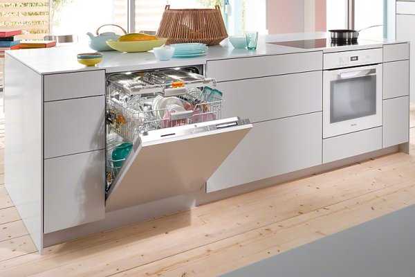 Если рабочая зона частично перенесена в «остров», представляющий собой автономный блок модулей в центре кухни, то посудомойку можно встроить и в него