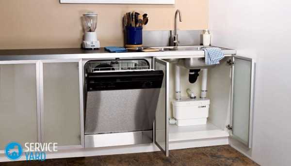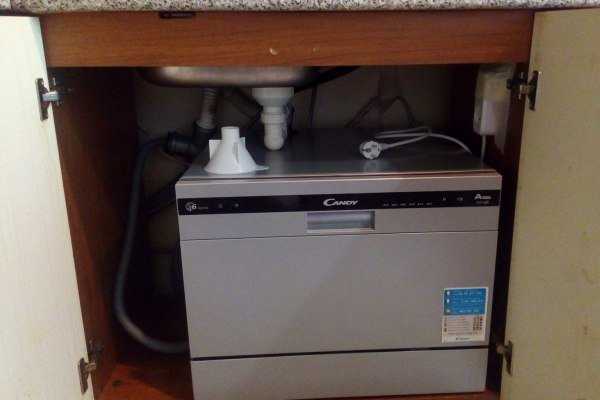 Если позволяют размеры компактной машины, ее можно поставить в шкаф, скрывающий коммуникации мойки. Этот способ облегчает подключение прибора, но пользоваться им не очень удобно
