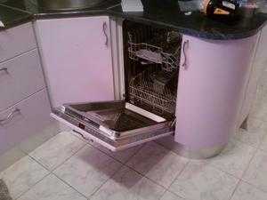 Производится действие обыкновенной болгаркой. Придется мебель от стены отодвинуть. Чтобы не откалывались куски полировки, направление вращения шлифовального диска должно прижимать слой лака к доске. Работать придется с обеих сторон, аккуратно. До начала следует в деталях продумать расположение шлангов посудомоечной машины и вычертить карандашом линии стачивания. Допустимо пользоваться дрелью, электрическим лобзиком, прочим плотницким инструментом.