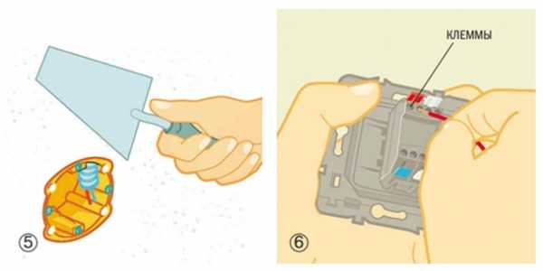 Вставьте кабель в монтажную коробку, предварительно удалив в ней заглушку с нужной стороны. Заполните углубление раствором алебастра и установите коробку, выровняв ее по горизонту (4). Нанесите на стену штукатурку вокруг монтажной коробки и поверх проводки в пазу стены (5). После схватывания раствора подсоедините (6) и установите саму розетку (7), а потом декоративную рамку (8). Подробнее о подсоединении розеток.