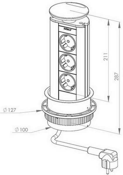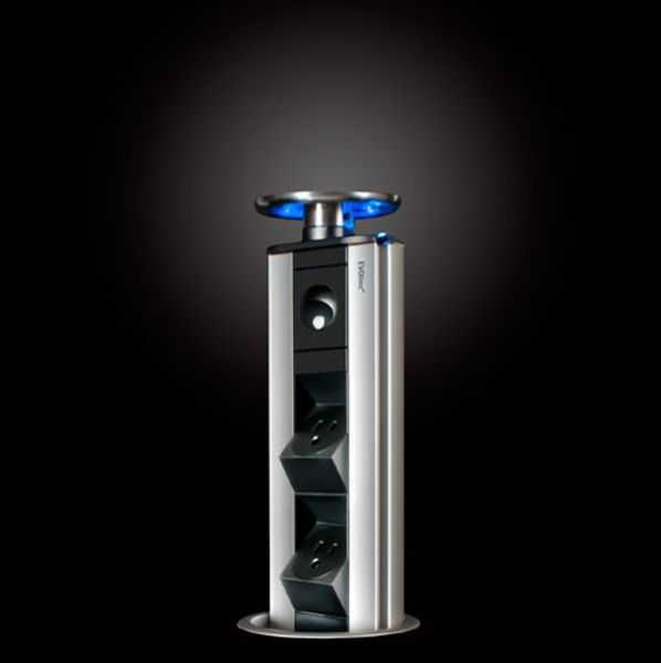 - Вертикальная выдвижная розетка из столешницы. Конструкция оборудована круглой крышкой диаметром от 60 до 102 мм для стандартных моделей, и от 102 до 120 мм для блоков, предоставляющих возможность закрытия без отсоединения приборов. Выдвижение происходит при нажатии на крышку, после чего гнезда легко поворачиваются в нужную сторону.