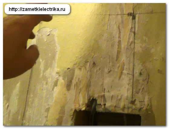 Теперь необходимо подготовить ниши, т.е. выдолбить проемы в стене по отмеченным размерам с небольшим запасом в бОльшую сторону для штукатурки. Глубина щита составляет 8 (см), поэтому глубину ниши делаем также чуть больше глубины самого щита.