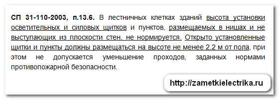 Правда есть небольшое исключение: если щит открытой установки расположен на лестничной клетке, то расстояние от пола до щита должно быть не менее 2,2 метра (СП 31-110-2003, п.13.6), дабы не загромождать и не уменьшать проходы, согласно норм пожарной безопасности, т.к. проходы на лестничной клетке относятся к путям эвакуации в случае пожара.
