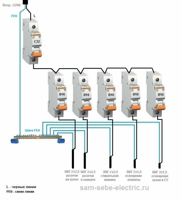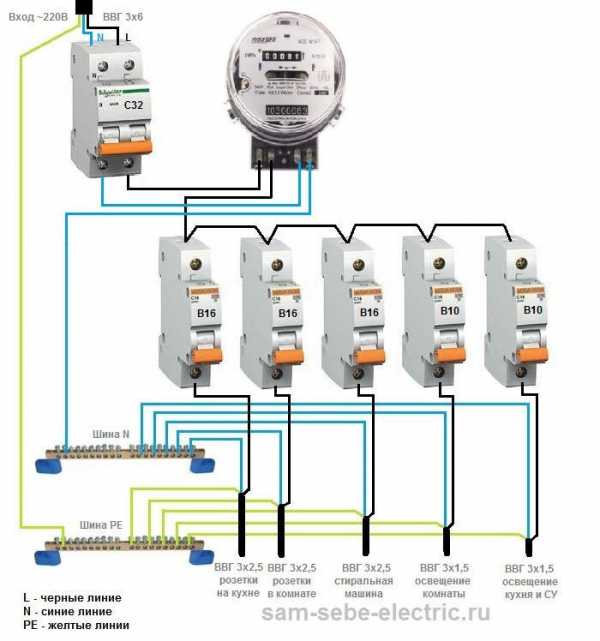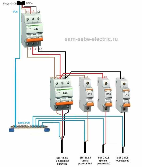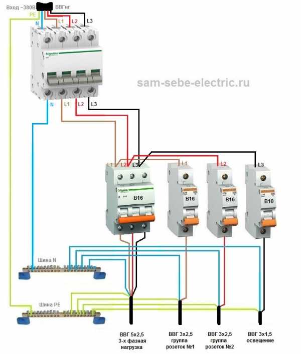 Однофазная схема распределительного щита будет выглядеть примерно так: