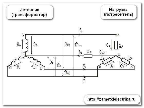 В рассматриваемом случае напряжение смещения нейтрали равно нулю (UnN = 0), а значит фазные напряжения у источника питания (трансформатор) и на нагрузке (потребители) совершенно одинаковые: