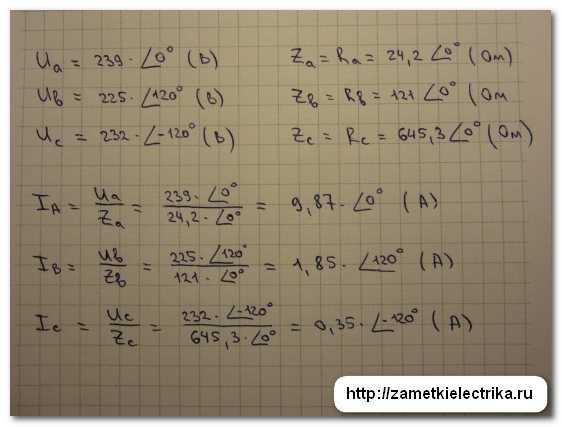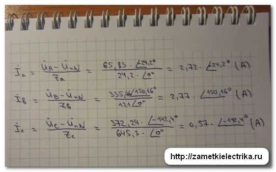 А теперь, опять же ссылаясь на закон Ома, рассчитаем фазные токи.