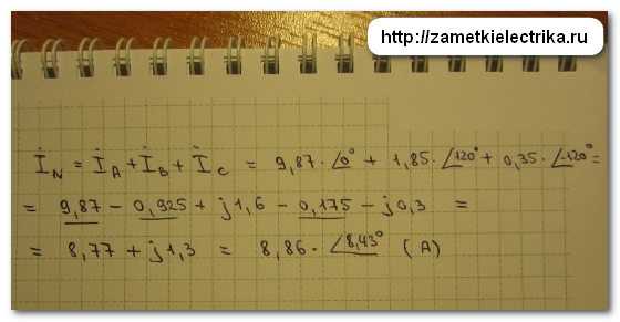 Ради интереса можно рассчитать ток в нулевом проводе, который равен геометрической сумме всех фазных токов. Для удобства сложения комплексных чисел переведу их из показательной формы в алгебраическую, а результат запишу опять в показательной.