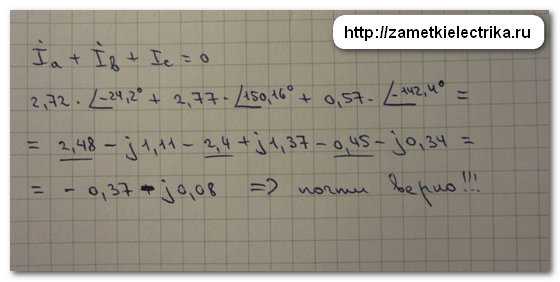 Проведем проверку наших расчетов по первому закону Кирхгофа — геометрическая сумма токов всех фаз при обрыве нулевого провода должна быть равна нулю. Вот и проверим это тождество.
