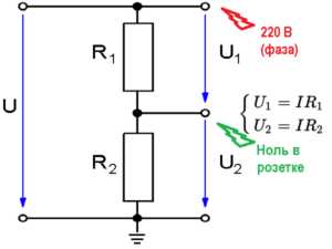 Электрики знают, что и на нуле небольшой потенциал все же есть, и он зависит от величины протекающего тока (I) и удаленности от точки заземления. Чтобы понять данный процесс, нужно вспомнить задачу из школьного курса физики о расчете напряжений (делитель U1. U2 ) в точке соединения двух последовательно включенных сопротивлений (R1. R2 ). В нашем случае это будут сопротивления кабеля фазы и подключенной нагрузки (R1 ,) и R2 участка нулевого провода до точки заземления .