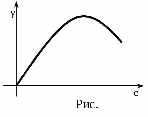 представляет собой электропроводность электролита. Как видно из выражения (23), проводимость электролитов растет с повышением температуры, т.к. при этом увеличивается коэффициент диссоциации и подвижность ионов. Зависимость γ от концентрации довольно сложная (рис.): Для слабых растворов, когда α ≈ 1, γ растет пропорционально с. В дальнейшем с увеличением концентрации коэффициент диссоциации α убывает, поэтому рост проводимости замедляется, а затем даже начинает уменьшаться.